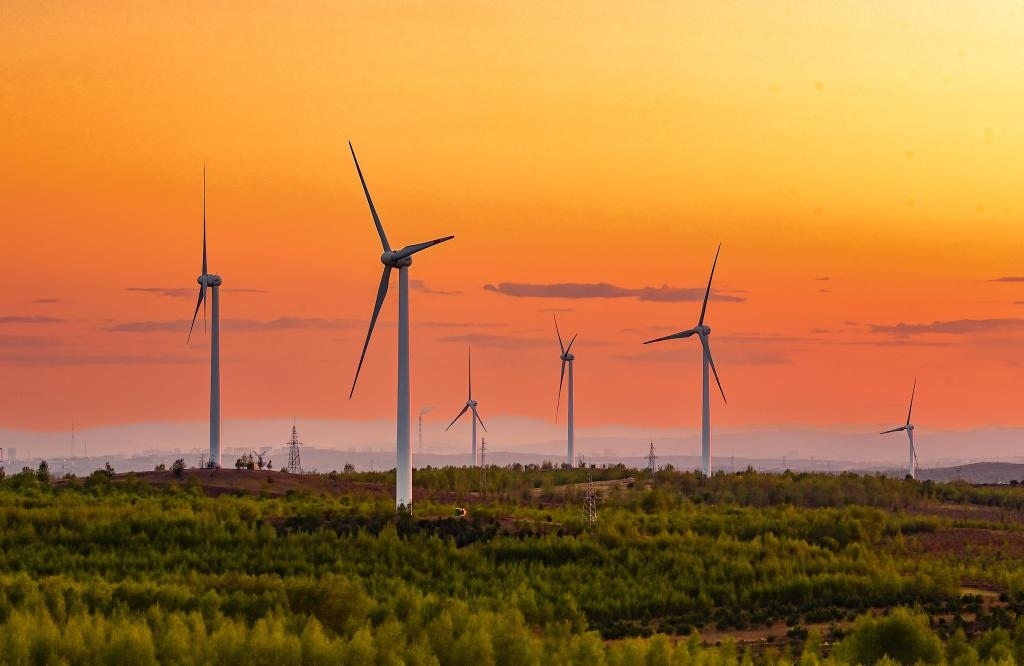 5月23日清晨拍攝的興安盟烏蘭浩特市呼和馬場風力光伏發(fā)電場內的風機。新華社發(fā)(王正攝)