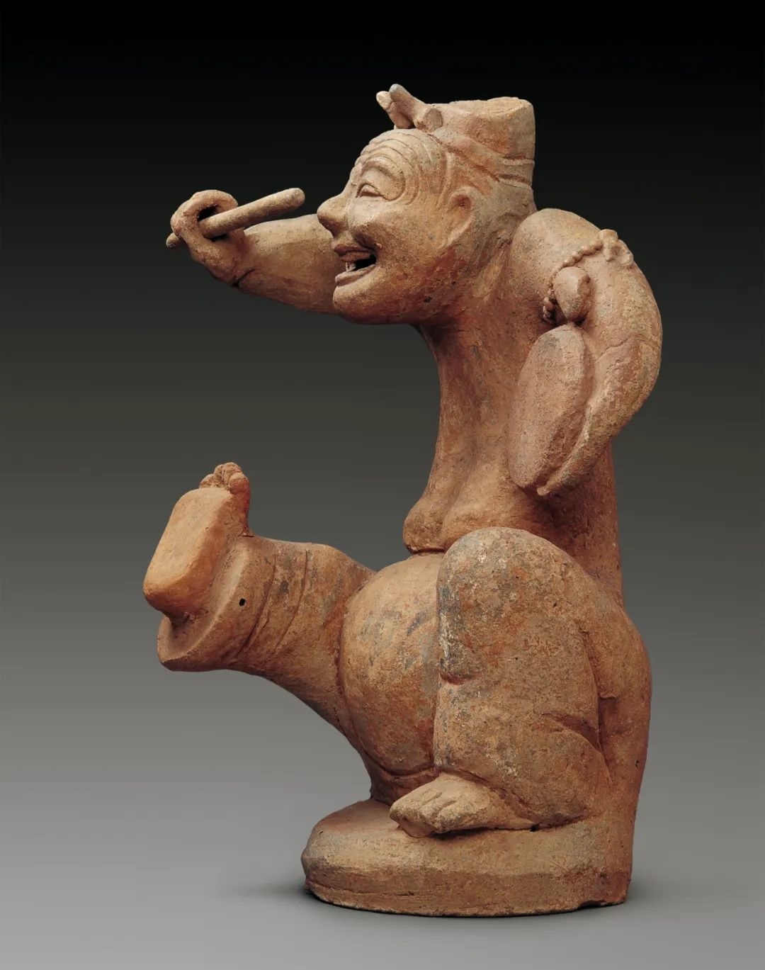 漢代民間極為盛行說唱表演。這件陶俑袒胸露腹,著褲赤足,左臂挾鼓,右手舉槌,作擊鼓說唱表演,神態(tài)詼諧,動作夸張,是一件富有濃厚民間氣息和地方風(fēng)貌的優(yōu)秀雕塑作品。在四川的東漢墓中先后出土多件形象類似的擊鼓說唱俑,這說明當(dāng)時蜀地說唱表演頗為流行。