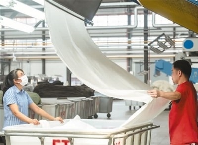 近日,在廣西梧州岑溪市大業(yè)鎮(zhèn)的西部(岑溪)創(chuàng)業(yè)園泰森新紡織產(chǎn)業(yè)集聚區(qū)某車間,染整智能生產(chǎn)線開足馬力高效作業(yè),工人們在崗位上忙碌,呈現(xiàn)出一片熱火朝天的生產(chǎn)景象。岑溪泰森項目以數(shù)字化轉型為主要發(fā)展方向,打造數(shù)字化轉型“5G+智慧工廠”行業(yè)新標桿。 何華文攝(人民視覺)