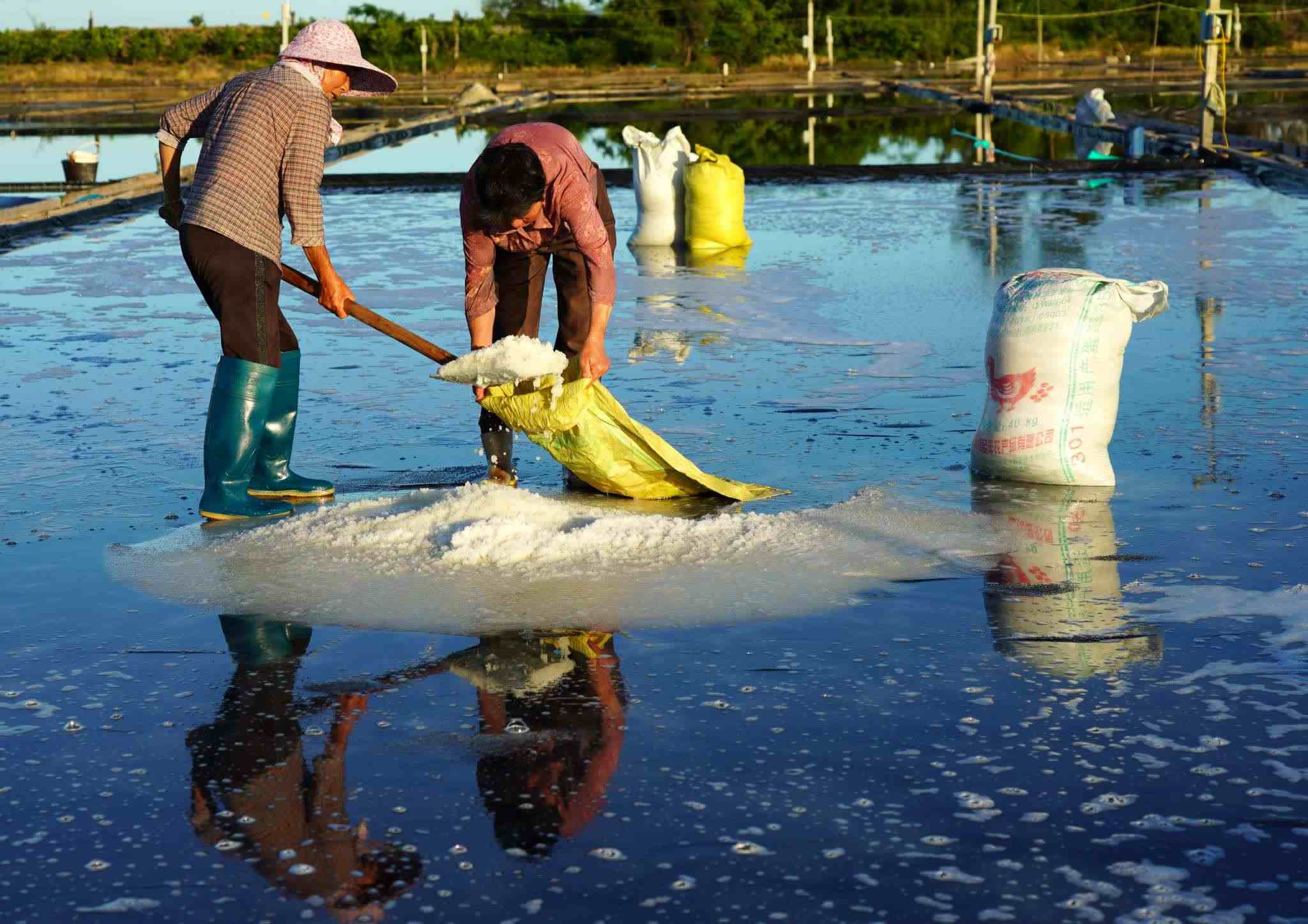 2023年5月29日,浙江溫州,在樂清市南塘鎮(zhèn)山馬曬鹽場,鹽民在鹽田里收鹽。視覺中國