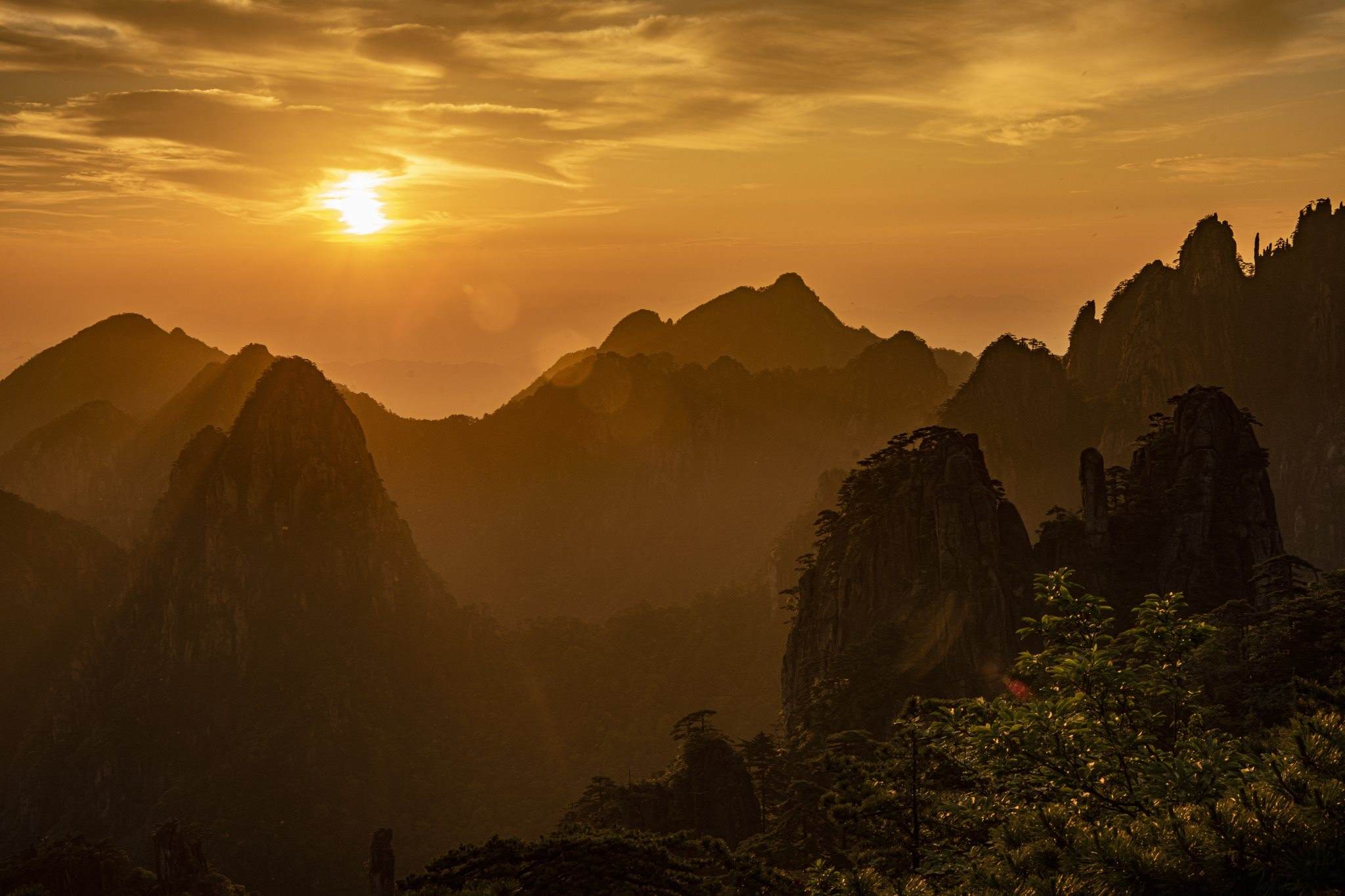 安徽黃山:霞光渲染下的奇峰秀色