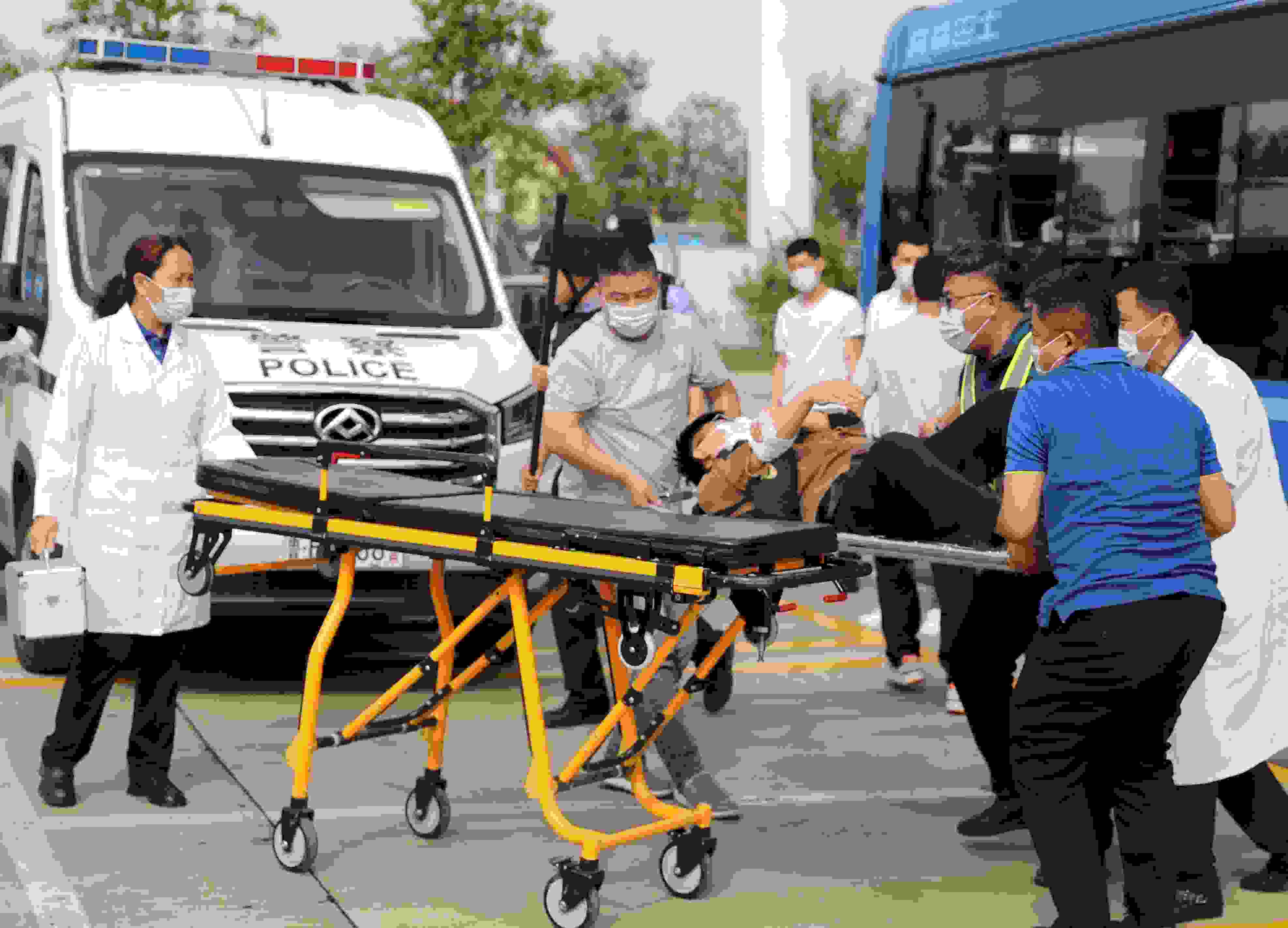 當(dāng)日,青島真情巴士集團(tuán)聯(lián)合青島西海岸新區(qū)治安、消防、應(yīng)急、環(huán)保、交警等部門在金沙灘啤酒城開展道路交通事故及突發(fā)事件應(yīng)急演練,此次演練旨在進(jìn)一步完善青島西海岸新區(qū)道路交通應(yīng)急救援體系,提高道路交通應(yīng)急處置能力。 (張進(jìn)剛 攝)