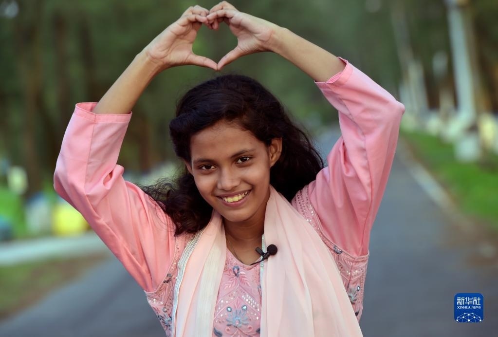 5月26日,在孟加拉國首都達卡,阿里法·沁做出愛心手勢表達對中國的愛意。新華社發(fā)