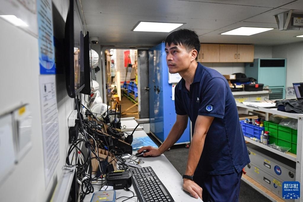 潛航員在“探索一號(hào)”科考船上整理從水下采集的考古數(shù)據(jù)(5月25日攝)。