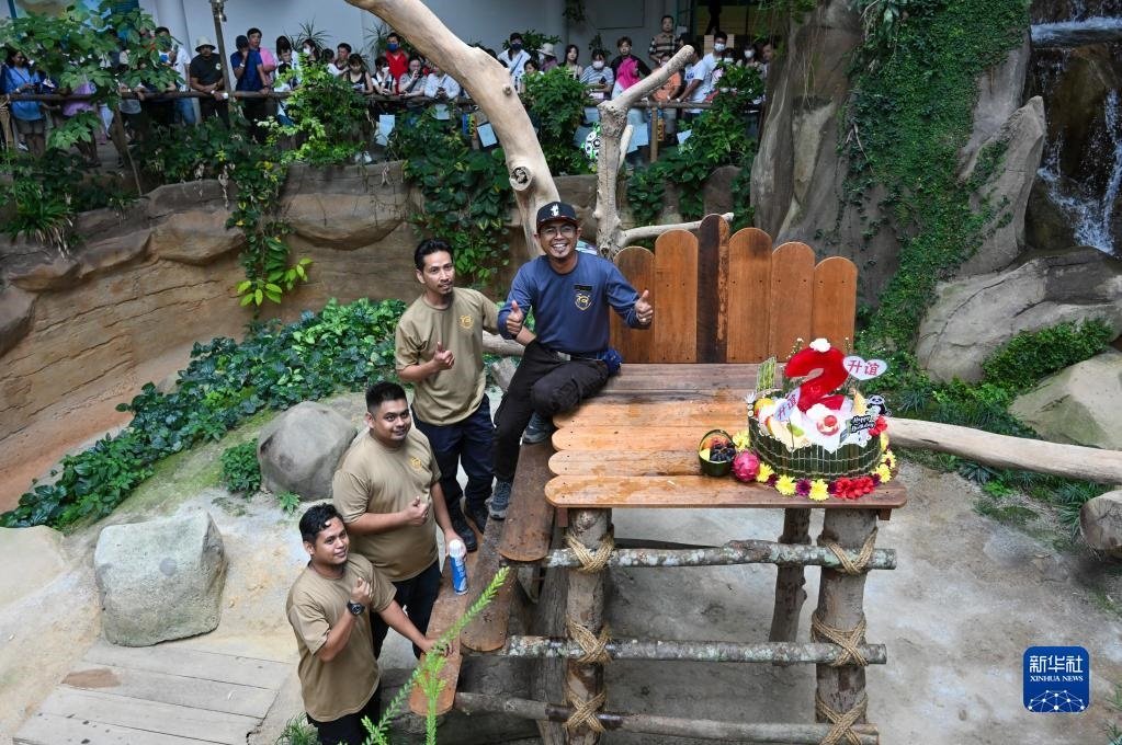 5月31日,在馬來(lái)西亞吉隆坡附近的馬來(lái)西亞國(guó)家動(dòng)物園,大熊貓飼養(yǎng)員阿克邁勒(右)和他的團(tuán)隊(duì)與“升誼”的生日蛋糕合影。
