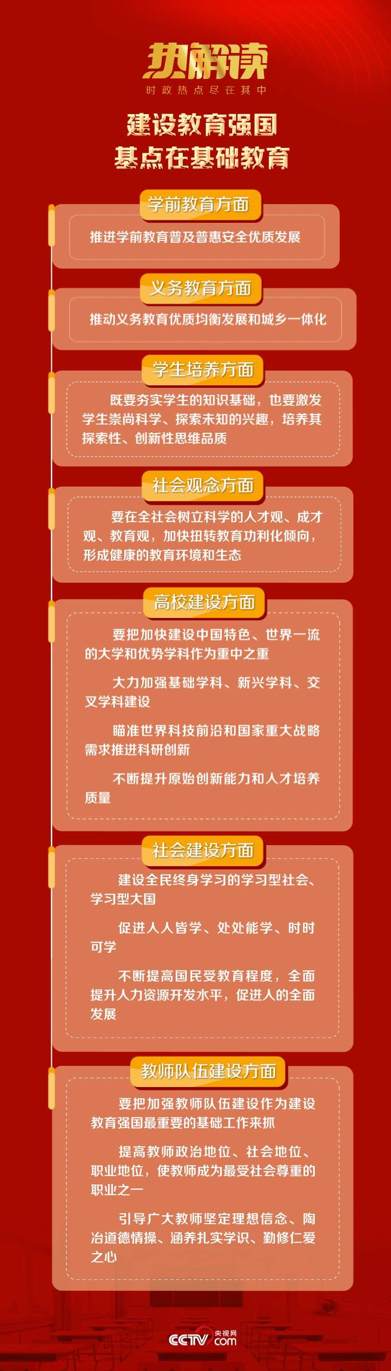 學(xué)前教育普及普惠安全優(yōu)質(zhì)發(fā)展;義務(wù)教育優(yōu)質(zhì)均衡發(fā)展和城鄉(xiāng)一體化;在全社會樹立科學(xué)的人才觀、成才觀、教育觀……這些始終是總書記關(guān)心的重點。做什么、怎么做,總書記明確給出了推動基礎(chǔ)教育、加快建設(shè)高質(zhì)量教育體系的方法路徑。
