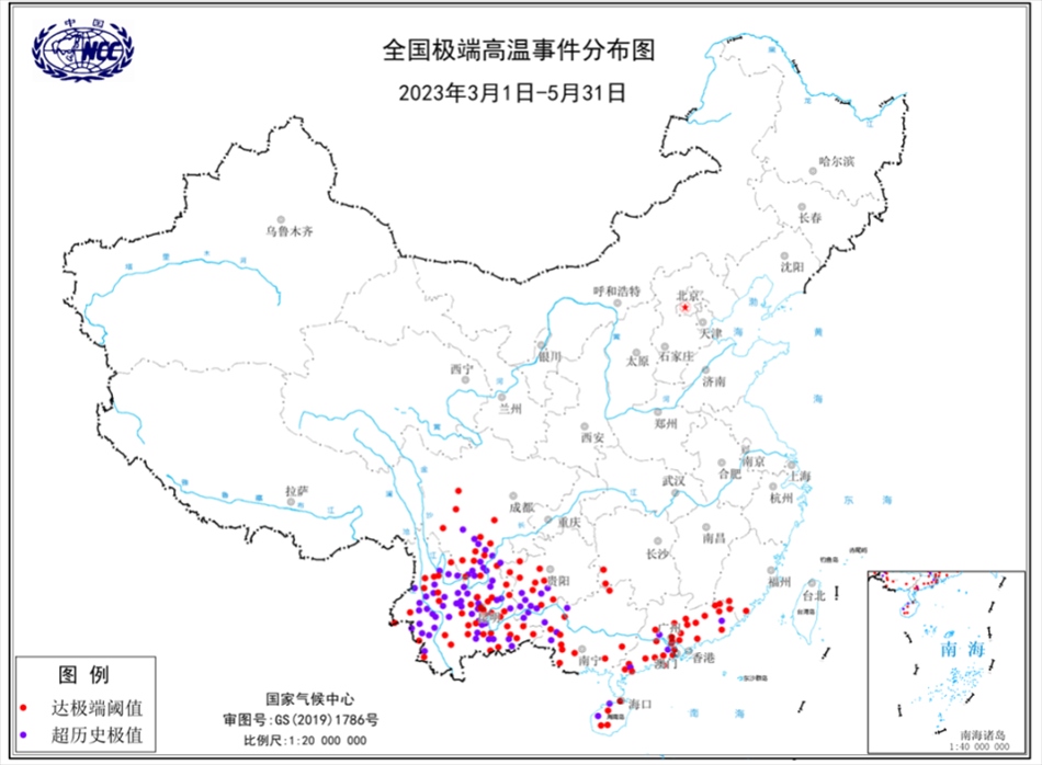 春季,全國共有118個(gè)國家氣象站的日降水量突破當(dāng)月歷史極大值,其中31站的日降水量突破春季歷史極大值,福建邵武(275.1毫米,5月6日)、江西宜黃(258.1毫米,5月6日)、貴州修文(228.3毫米,5月26日)日降水量突破歷史極值。