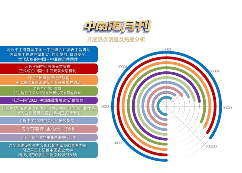 央視網(wǎng)“智聞”系統(tǒng)提取分析5月全網(wǎng)時政新聞熱點顯示,“習(xí)近平主持首屆中國—中亞峰會并發(fā)表主旨講話 強調(diào)攜手建設(shè)守望相助、共同發(fā)展、普遍安全、世代友好的中國—中亞命運共同體”“習(xí)近平同中亞五國元首宣布正式成立中國—中亞元首會晤機制”“習(xí)近平出席歐亞經(jīng)濟聯(lián)盟第二屆歐亞經(jīng)濟論壇全會開幕式并致辭”等元首外交活動備受關(guān)注。