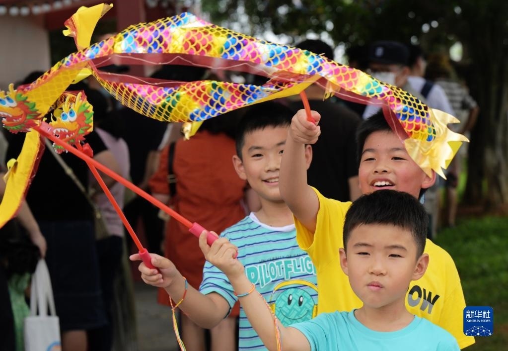 6月3日,廈門小學(xué)生在2023海峽兩岸(集美)龍舟文化節(jié)活動現(xiàn)場體驗舞龍。