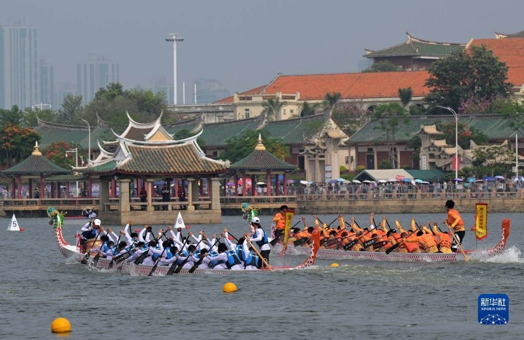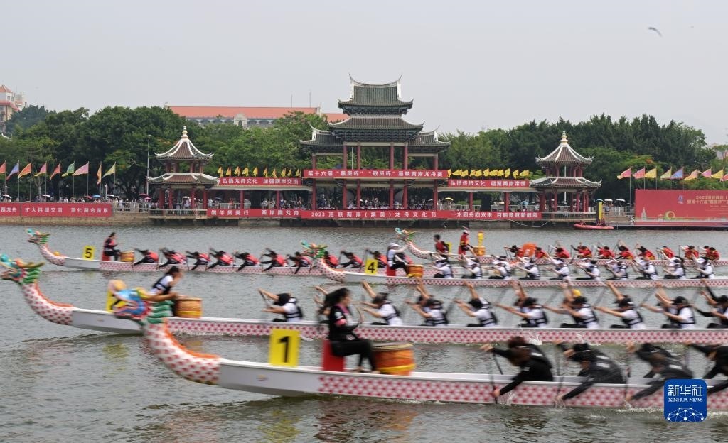 當(dāng)日,2023海峽兩岸(集美)龍舟文化節(jié)暨第十六屆“嘉庚杯”“敬賢杯”海峽兩岸龍舟賽在廈門集美龍舟池啟幕。來自海峽兩岸的47支龍舟隊伍在競賽中享受龍舟競渡的活力、中華傳統(tǒng)文化的魅力,共有約500名臺胞參與賽事。