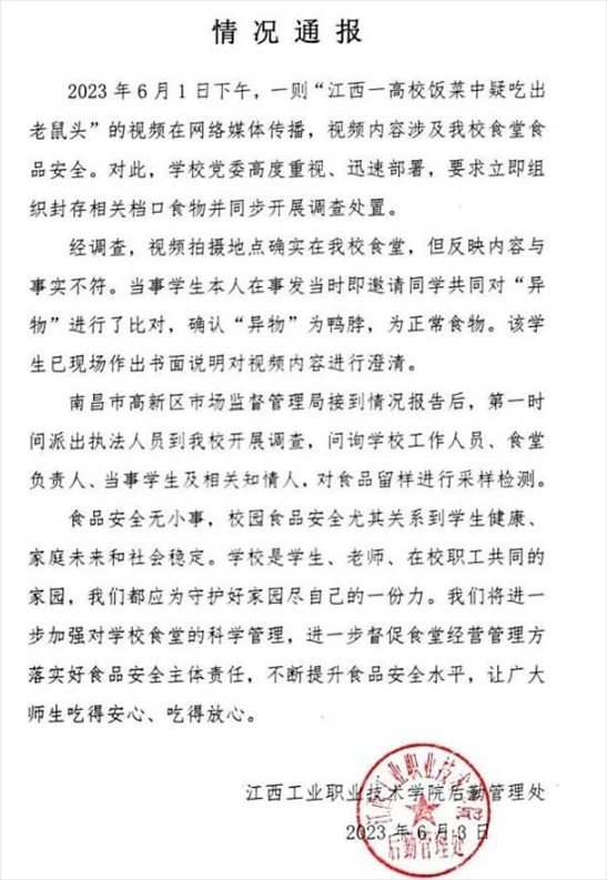 ·江西一學(xué)校食堂吃出“老鼠頭”?校方通報:“異物”是鴨脖。