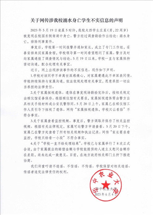 ·學(xué)生溺水身亡、不給家長看監(jiān)控視頻?華中農(nóng)業(yè)大學(xué)回應(yīng):傳言不實。