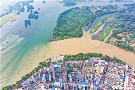受降雨影響,廣西桂林全州縣城湘江河段出現(xiàn)涇渭分明景觀??罩懈╊娼Я魅f鄉(xiāng)河混濁的河水繞城匯入清澈的湘江干流,交匯之處涇渭分明。