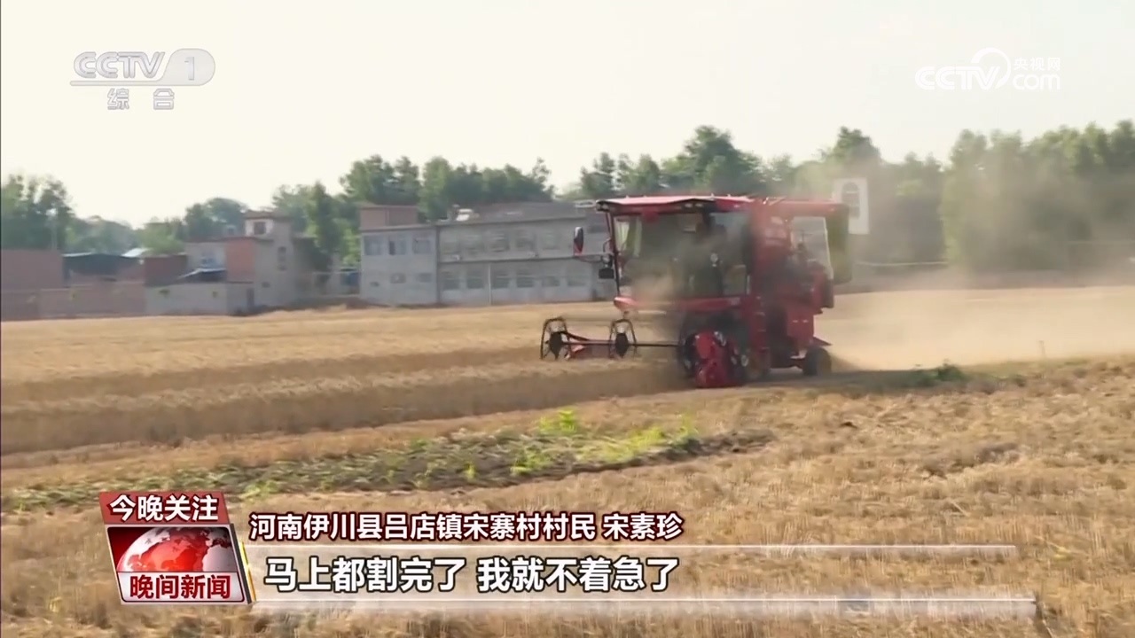 伊川縣呂店鎮(zhèn)宋寨村村民 宋素珍:前幾天下雨小麥?zhǔn)詹换貋?lái),心里可心慌,鄉(xiāng)里派履帶式收割機(jī),我這十幾畝地馬上都挨?。ㄝ喌剑┝耍R上都割完了,我就不著急了。