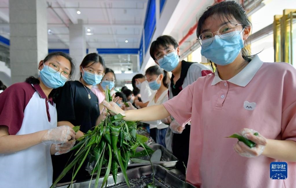 6月4日,湖北省宣恩縣一中的高三學(xué)生在展示包好的粽子。
