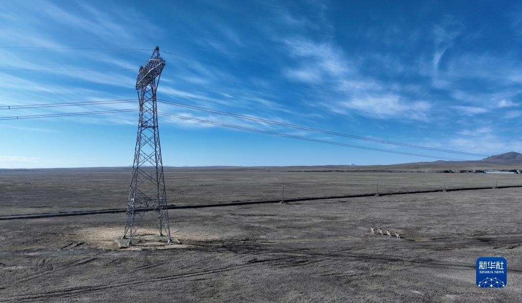 6月4日, 在青海省海西蒙古族藏族自治州格爾木市唐古拉山鎮(zhèn)境內(nèi),幾只藏野驢從青藏聯(lián)網(wǎng)工程輸電鐵塔前經(jīng)過(guò)(無(wú)人機(jī)照片)。