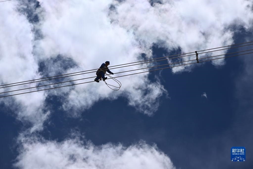 在青海省海西蒙古族藏族自治州格爾木市唐古拉山鎮(zhèn)境內(nèi),檢修人員在走線巡檢中(6月3日攝)。