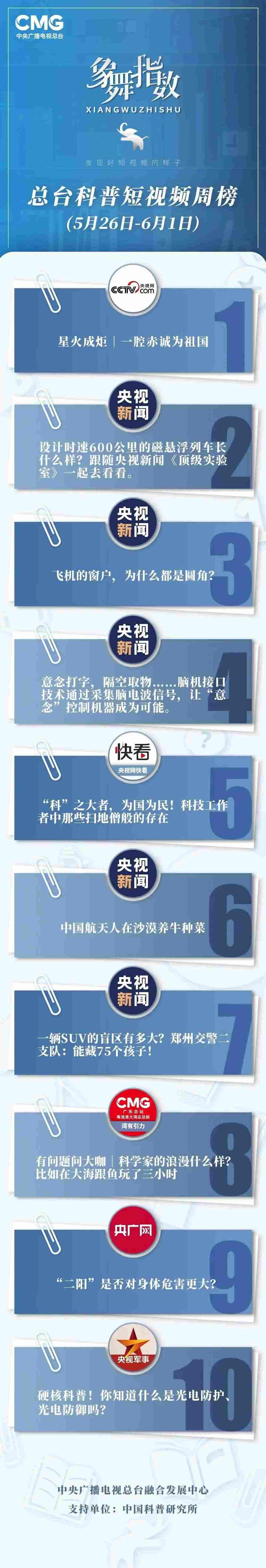 中央廣播電視總臺“象舞指數(shù)”評議品牌,推出科普短視頻周榜、總臺科普短視頻周榜。在2023年5月26日-6月1日,值得注目的內(nèi)容有: