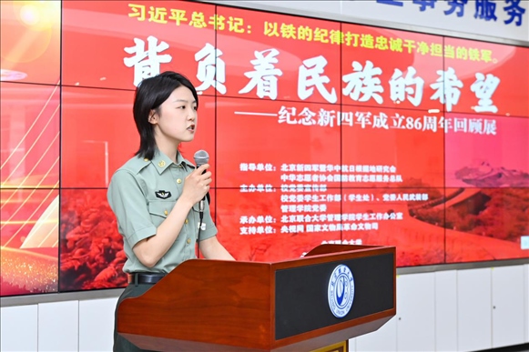 為深入學(xué)習(xí)貫徹習(xí)近平新時代中國特色社會主義思想主題教育,落實習(xí)近平加強全民國防教育的重要指示精神,弘揚愛國主義精神、增強全民國防意識,推動全民國防教育進校園,深化學(xué)?!按笏颊n”建設(shè),6月9日,由北京新四軍暨華中抗日根據(jù)地研究會、中華志愿者協(xié)會國防教育志愿服務(wù)總隊指導(dǎo),北京聯(lián)合大學(xué)黨委學(xué)生工作部(學(xué)生處)、黨委人民武裝部、黨委宣傳部、北京聯(lián)合大學(xué)新時代文明實踐中心建設(shè)規(guī)劃研究所、管理學(xué)院黨委共同主辦,管理學(xué)院學(xué)生工作辦公室承辦的“背負(fù)民族希望——紀(jì)念新四軍成立86周年回顧展”大會在北四環(huán)校區(qū)學(xué)生事務(wù)大廳舉行。