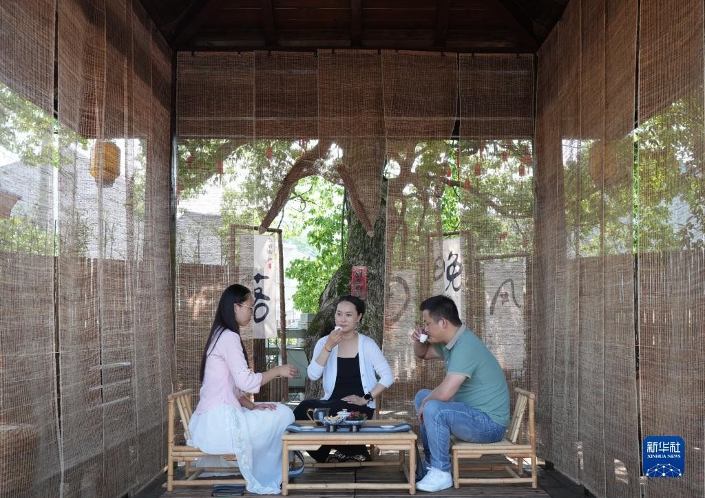 人們在浙江臺州黃巖區(qū)嶼頭鄉(xiāng)布袋坑村的溪水旁喝茶(5月30日攝)。近年來,嶼頭鄉(xiāng)堅持黨建引領(lǐng),以全域旅游和美麗鄉(xiāng)村建設(shè)為重要抓手,引進(jìn)文化創(chuàng)意團(tuán)隊(duì),為鄉(xiāng)村旅游注入更加年輕化的元素,推進(jìn)特色民宿以及布袋山饅頭、溪坑魚等農(nóng)特產(chǎn)品的發(fā)展,帶動鄉(xiāng)村振興和百姓共富。新華社記者 徐昱 攝