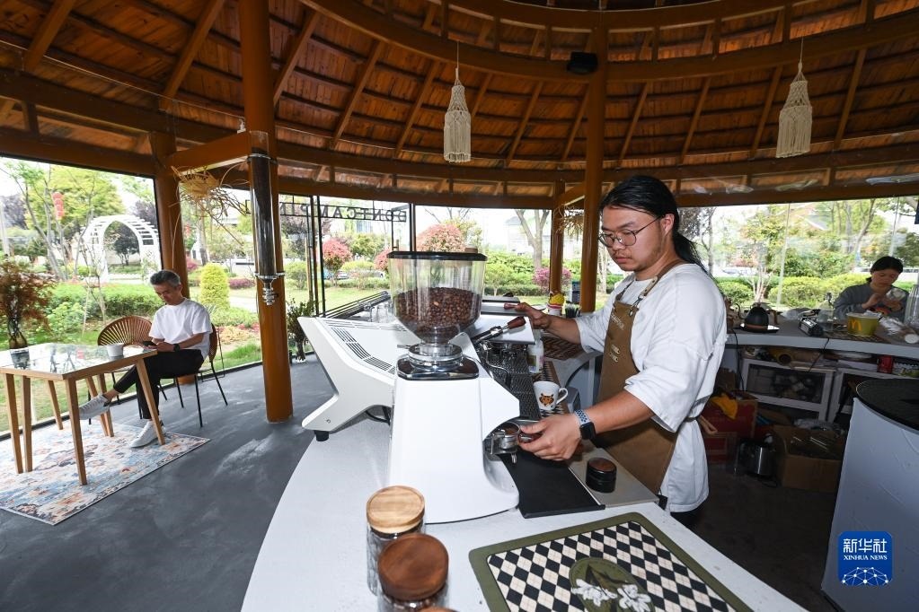 工作人員在浙江湖州織里鎮(zhèn)伍浦村漁耕文化園的陶灣里鄉(xiāng)村咖啡店工作(4月11日攝)。近年來,織里鎮(zhèn)依托當(dāng)?shù)孛利愢l(xiāng)村建設(shè)以及自然風(fēng)光,招引鄉(xiāng)賢返鄉(xiāng)創(chuàng)業(yè),依托閑置民宅、閑置土地建設(shè)特色咖啡店、花海景觀、特色民宿和農(nóng)家樂等,發(fā)展鄉(xiāng)村旅游經(jīng)濟(jì)。新華社記者 徐昱 攝