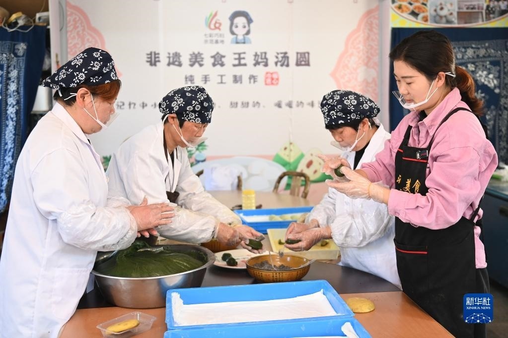 在浙江寧波奉化區(qū)西塢街道廟后周村,毛美兒(右一)與村民一同制作青團(tuán)(3月8日攝)。自2015年創(chuàng)業(yè)起,“王媽湯圓”負(fù)責(zé)人毛美兒將制作本地非遺美食的技藝傳授給當(dāng)?shù)貗D女,已帶動60余位農(nóng)村婦女制作、銷售美食,共同增收致富。新華社記者 黃宗治 攝