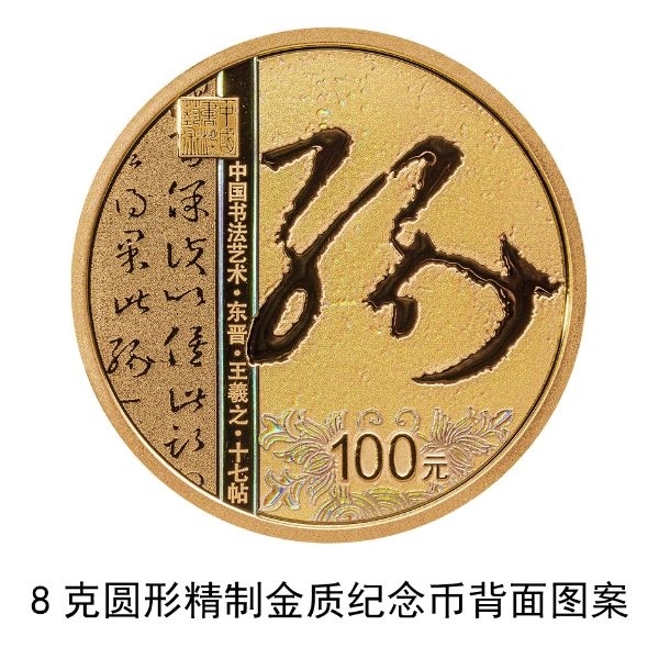8克圓形金質(zhì)紀(jì)念幣背面圖案為東晉王羲之書《十七帖》局部文字及“緣”字樣與裝飾紋樣、“中國書法藝術(shù)”篆刻鈐印等組合設(shè)計(jì),并刊“中國書法藝術(shù)·東晉·王羲之·十七帖”字樣及面額。