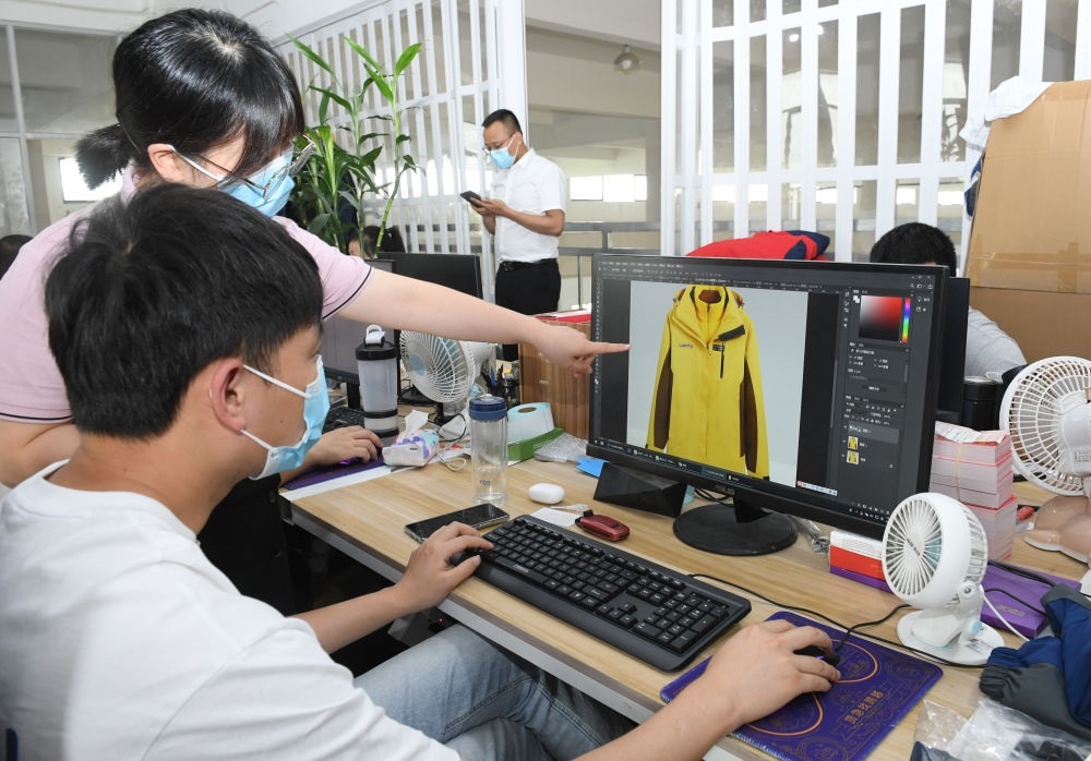 在浙江省臺州市三門縣的一家戶外用品企業(yè),工作人員在討論一款沖鋒衣的設(shè)計(2022年6月14日攝)。新華社記者 翁忻旸 攝