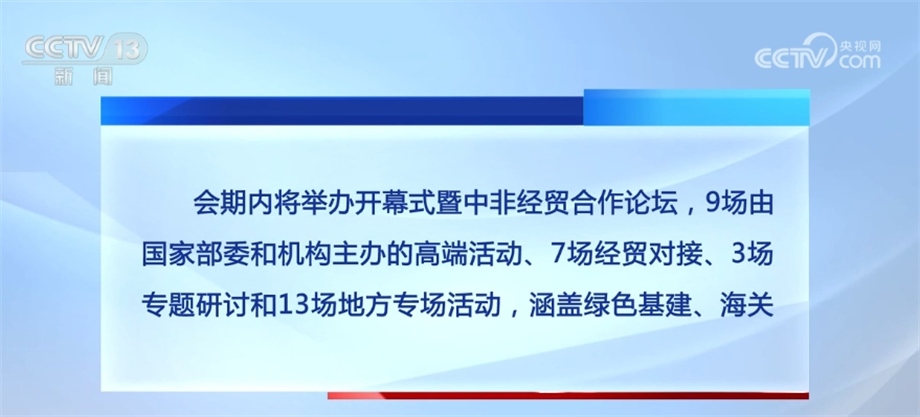會期內(nèi)將舉辦開幕式暨中非經(jīng)貿(mào)合作論壇,9場由國家部委和機構主辦的高端活動、7場經(jīng)貿(mào)對接、3場專題研討和13場地方專場活動,涵蓋綠色基建、海關檢疫、醫(yī)藥衛(wèi)生、農(nóng)食產(chǎn)品、輕工紡織、產(chǎn)業(yè)園區(qū)、婦女青年、職業(yè)教育等領域,還將發(fā)布《中非經(jīng)貿(mào)關系報告》、中非貿(mào)易指數(shù)等近20項成果。