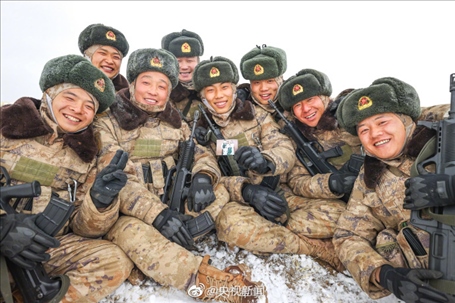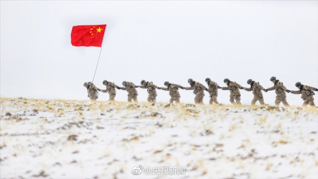 近日,新疆軍區(qū)某合成團官兵在海拔5200米的高原,開展邊境巡邏任務。皚皚白雪之上,邊防官兵手拉著手前行,臉頰凍得通紅,笑容卻堅定又自豪。