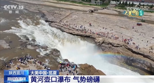 這是從陜西延安宜川縣拍攝到的黃河壺口瀑布。進(jìn)入夏季,壺口瀑布水位逐漸上升,水流開(kāi)始增大,迎來(lái)夏季最佳觀賞期。從空中俯瞰,主瀑布波浪翻滾,氣勢(shì)磅礴,水霧在陽(yáng)光的照射下形成彩虹。