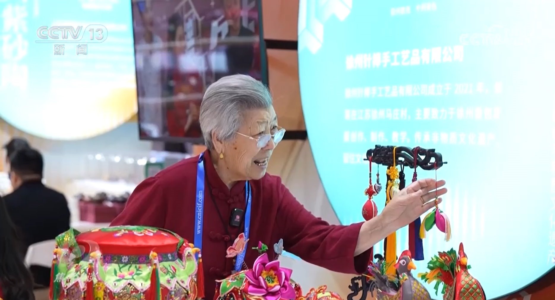 在江蘇展區(qū),一位正在做針線活的白發(fā)老人引人注目,她是江蘇省級非遺項(xiàng)目傳承人王秀英。王奶奶做的徐州香包名字叫作“針棒”,有著豐厚的文化蘊(yùn)涵和文化價(jià)值,入選第一批國家級非物質(zhì)文化遺產(chǎn)擴(kuò)展項(xiàng)目名錄。這次和王奶奶一同來參展的還有她的孫女孫歌堯。在學(xué)習(xí)傳統(tǒng)工藝的同時(shí),孫歌堯大膽創(chuàng)新,嘗試融入更多技法和材質(zhì)。