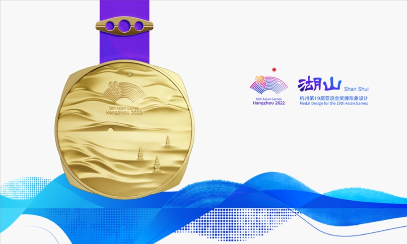 獎牌取名為“湖山”,它的設計靈感源自五千年良渚文明,展示中國江南文化,呈現(xiàn)杭州山水景觀。在亞運會獎牌設計中首次將方形玉琮和圓形獎章融為一體,其中獎牌正面用凸出的線條勾勒出“三面云山一面城”的杭城畫卷,湖水漣漪,山巒起伏;獎牌背面,形似方形印章,寓意運動員們在杭州亞運會上留下美好的印記。