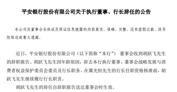 6月9日,平安銀行發(fā)布公告,原行長胡躍飛辭職。這位已在平安工作了數(shù)十年的“老將”因年齡原因辭去該行執(zhí)行董事、董事會(huì)戰(zhàn)略發(fā)展與消費(fèi)者權(quán)益保護(hù)委員會(huì)委員及行長職務(wù)。