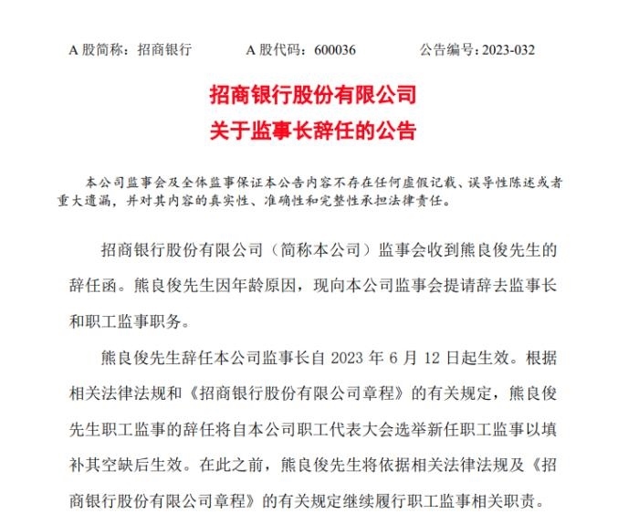 同在13日,招商銀行發(fā)布公告,該行監(jiān)事長熊良俊因年齡原因辭任。招商銀行表示,熊良俊自2021年8月起擔(dān)任招商銀行監(jiān)事長。