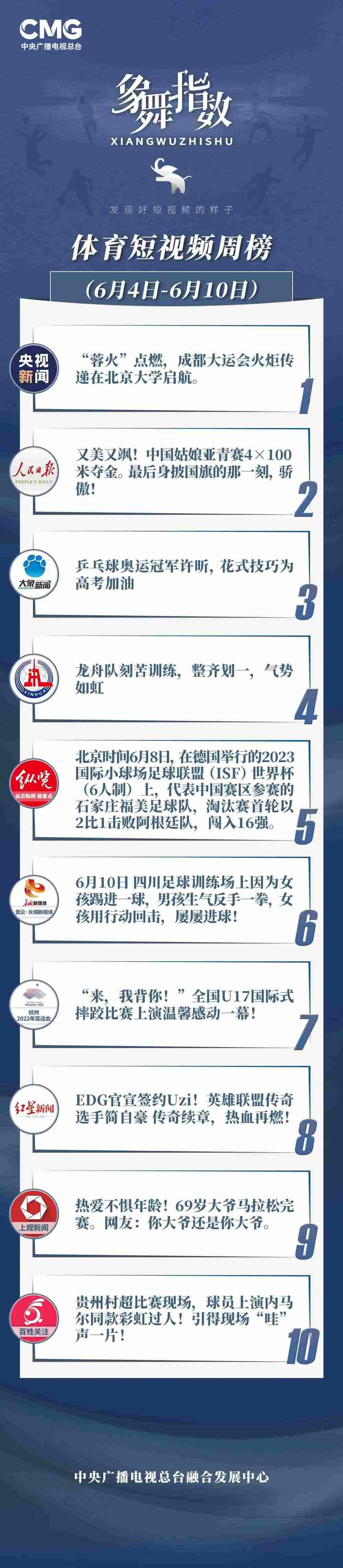 中央廣播電視總臺“象舞指數(shù)”評議品牌,推出體育短視頻周榜、總臺體育短視頻周榜。在6月4日—6月10日,以下內容獲得矚目: