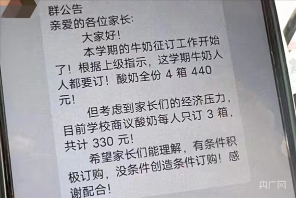 ·駐馬店正陽縣教育局發(fā)布關于正陽縣某學校涉嫌違規(guī)征訂學生飲用奶的調查情況通報:涉事班級解讀文件出現(xiàn)偏差。處理意見:立即暫停征訂工作,進行整頓規(guī)范,對相關責任人員進行調查。