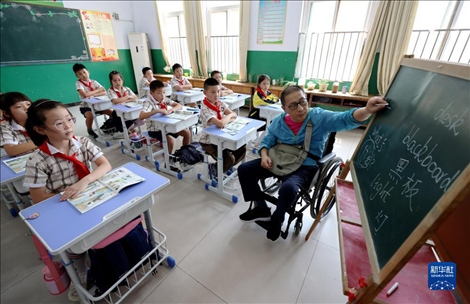今年48歲的楊季剛是山東省棗莊市永安鎮(zhèn)遺棠小學一名鄉(xiāng)村教師,從教已28年。2017年初,楊季剛因意外摔成重傷,終生將與輪椅為伴??恐B強的毅力,歷經(jīng)康復訓練的艱辛,2018年秋季楊季剛如期回到了校園,在特制1米高的小黑板上頑強地續(xù)寫他的教師生涯。