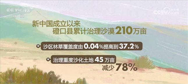 數(shù)據(jù)顯示,新中國成立以來,磴口縣累計治理沙漠210萬畝,沙區(qū)林草覆蓋度由0.04%提高到37.2%,治理重度沙化土地45萬畝,減少78%,向黃河年輸沙量減少到370萬噸,降低94.7%,沙漠治理呈現(xiàn)出“整體好轉(zhuǎn)、改善加速”的良好態(tài)勢,也因此形成了防沙治沙“磴口模式”。