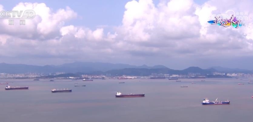 我們飛越兩座亞運(yùn)場(chǎng)館,將要看到的就是寧波最閃亮的名片之一:寧波舟山港。繁忙是這座港口的常態(tài)。當(dāng)我們的直升機(jī)遠(yuǎn)遠(yuǎn)地飛行,還沒有靠近港口的時(shí)候,就能先看到港口外的這片海域——洋小貓水域,這里是船舶經(jīng)南航道進(jìn)出寧波舟山港核心港區(qū)的一條必經(jīng)之路。向下看,大家可以看到海面上星星點(diǎn)點(diǎn)的船只,來自全球各地滿載商品貨物的遠(yuǎn)洋船舶在這里交匯。