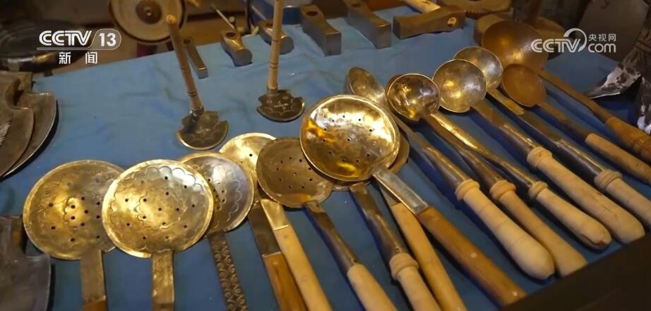 總臺(tái)記者 劉菲:如今的古城最吸引人們的并非熱鬧的商業(yè)街,而是一個(gè)個(gè)非物質(zhì)文化遺產(chǎn)的手工制作,現(xiàn)在在古城里有20多種的非遺制作。在很多年前我曾經(jīng)來(lái)過(guò)這里,這里就是一個(gè)小小的鐵匠鋪,而如今再來(lái)到這兒,已經(jīng)變成了一個(gè)打鐵技藝的展示館。小到一個(gè)湯勺,大到生產(chǎn)農(nóng)具,聽著這打鐵的聲音,也仿佛把我?guī)Щ亓水?dāng)年。