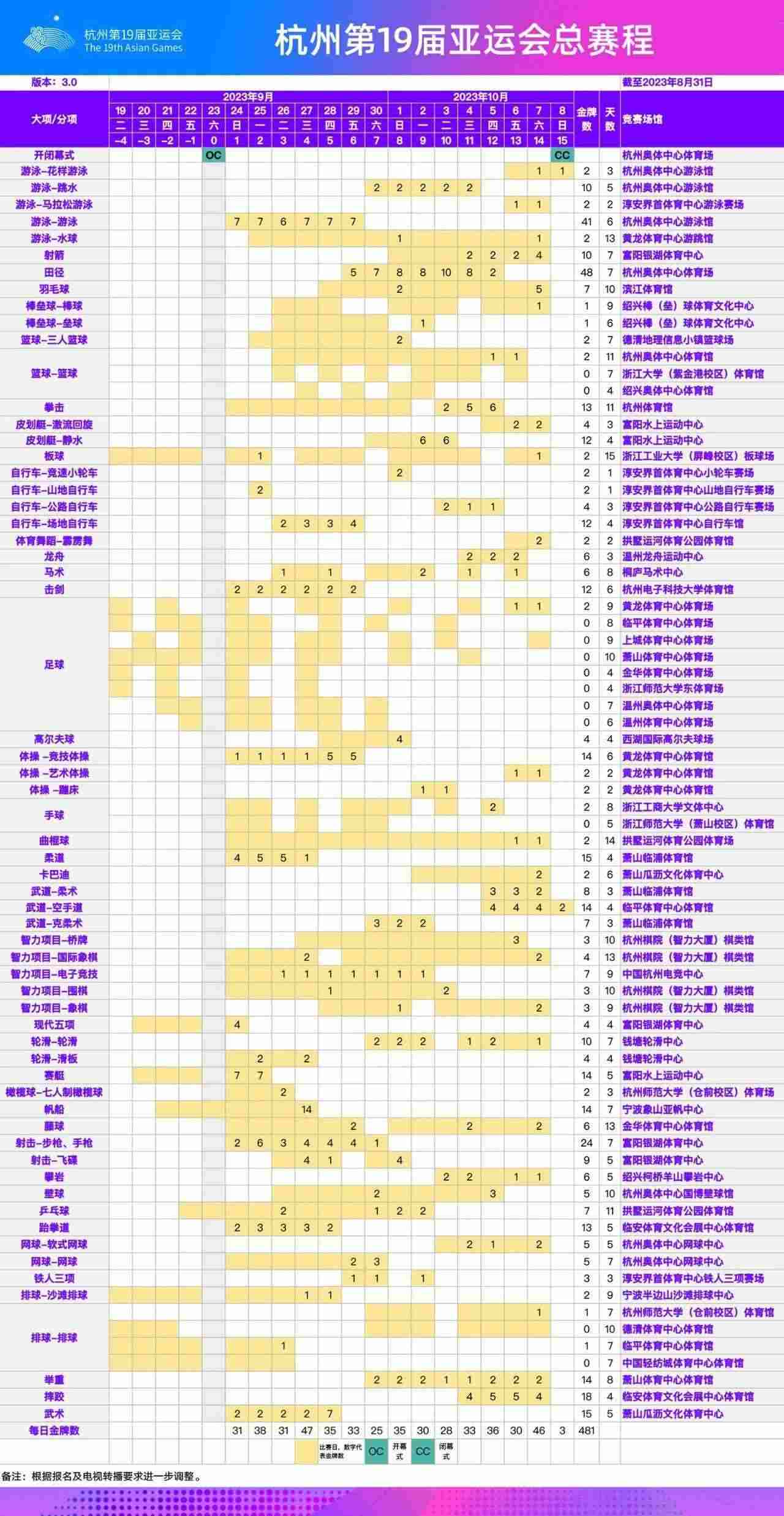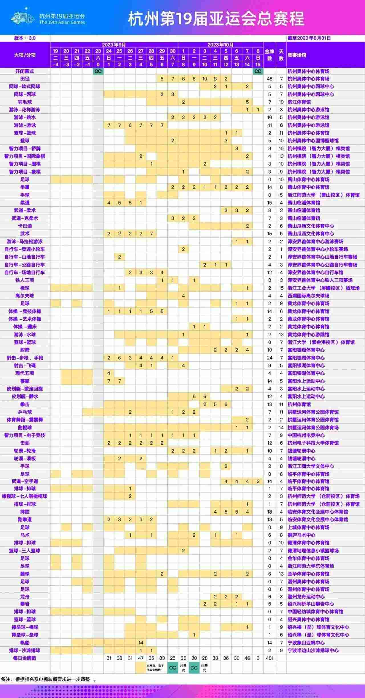 根據(jù)最新報名調整情況,經杭州亞運會各項目技術代表確認,杭州亞運會總賽程已更新至3.0版。