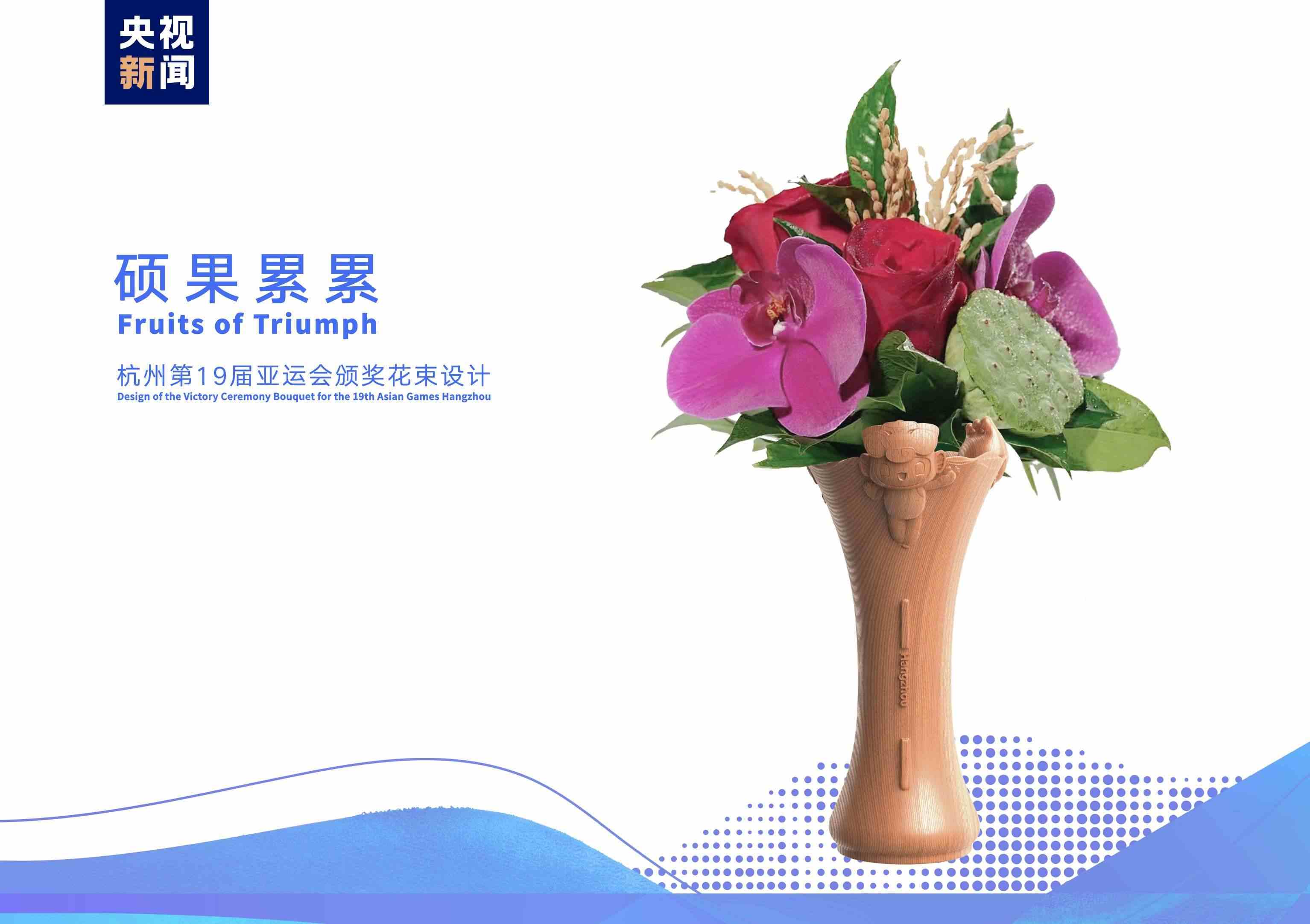 頒獎花束名為“碩果累累”,花材以寓意豐收和成果的稻穗和蓮蓬,名為“赤子之心”的中國自育品種月季,代表亞運“虹韻紫”的蝴蝶蘭,以及杭州特色植物龍井茶枝和桂花枝等組成,展現(xiàn)杭州獨特的文化內涵和城市魅力。