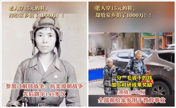 馬旭,我國(guó)第一代女空降兵,曾和黃繼光在同一部隊(duì),參加過(guò)解放戰(zhàn)爭(zhēng)、抗美援朝戰(zhàn)爭(zhēng)。5年前的今天,年過(guò)八旬的馬旭夫婦去銀行匯款,因數(shù)額巨大,銀行工作人員擔(dān)心老人被騙報(bào)警,民警趕到現(xiàn)場(chǎng)后,核實(shí)發(fā)現(xiàn)兩位老人確實(shí)決定將畢生積蓄1000萬(wàn)元,分兩次全部捐給家鄉(xiāng)。也正是這次“烏龍”,讓馬旭夫婦出現(xiàn)在了公眾視野。她曾獲評(píng)“感動(dòng)中國(guó)2018年度人物”,頒獎(jiǎng)詞是:你畢生節(jié)儉,只為一次奢侈,耐得清貧,守得心靈的高貴。