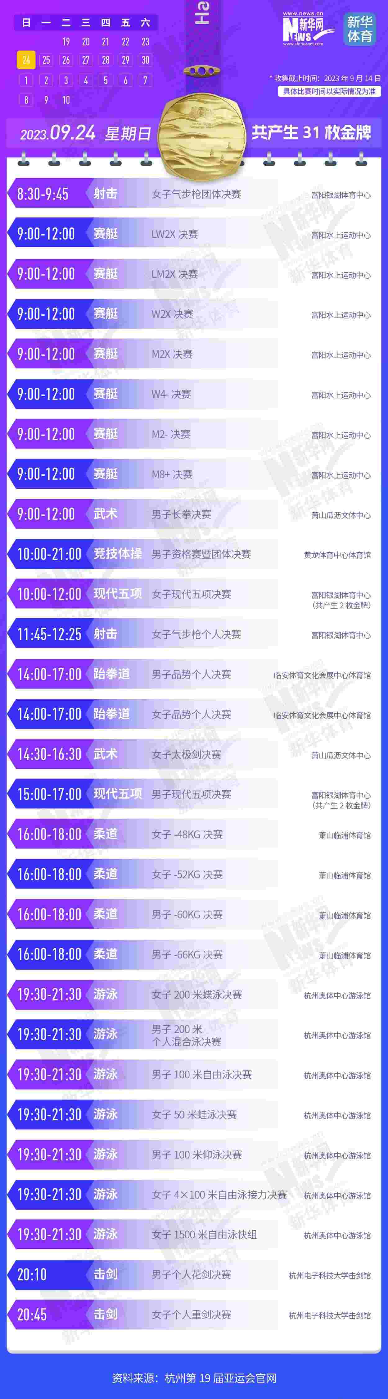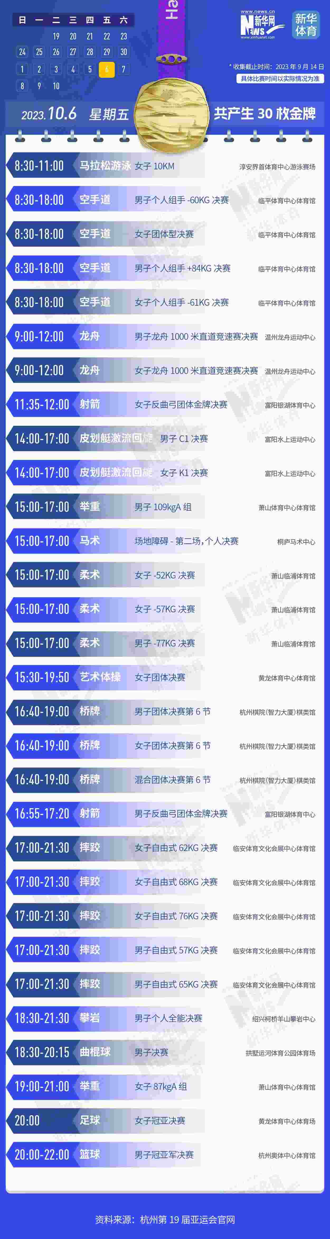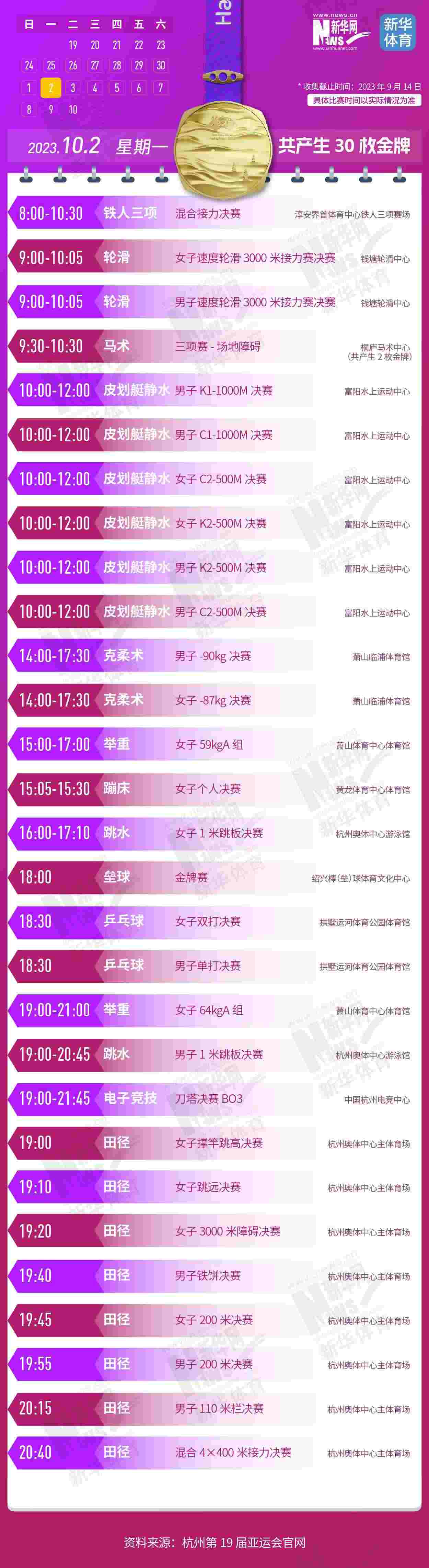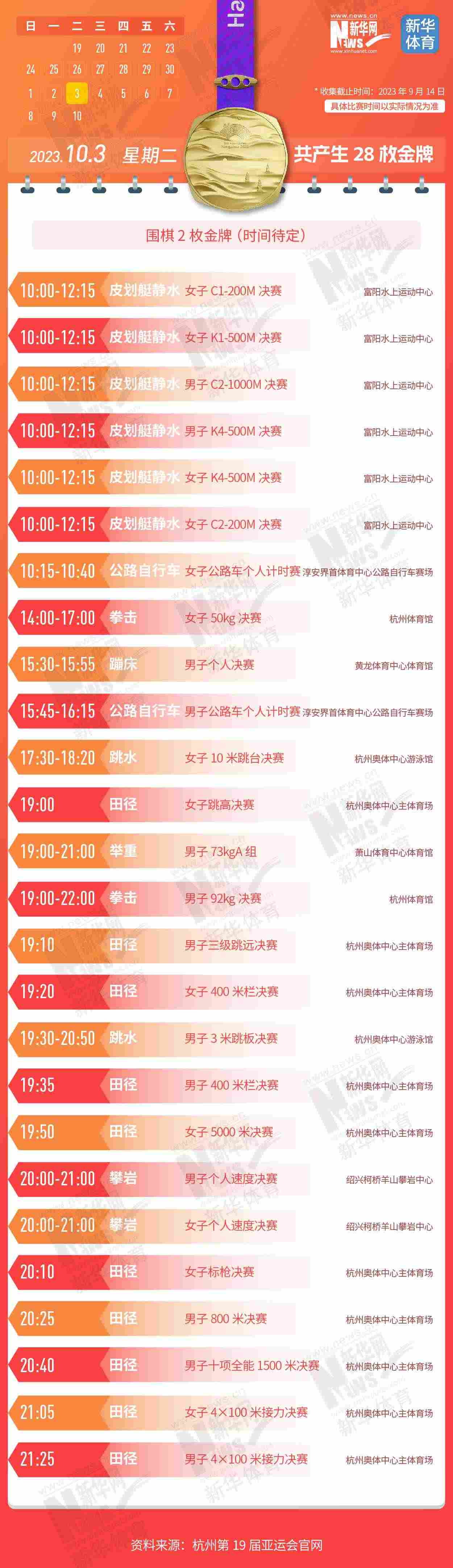 杭州第19屆亞運(yùn)會(huì)即將開幕。本屆亞運(yùn)會(huì)將產(chǎn)生481枚金牌,快收藏這份金牌賽事日歷,助你精準(zhǔn)觀賽!