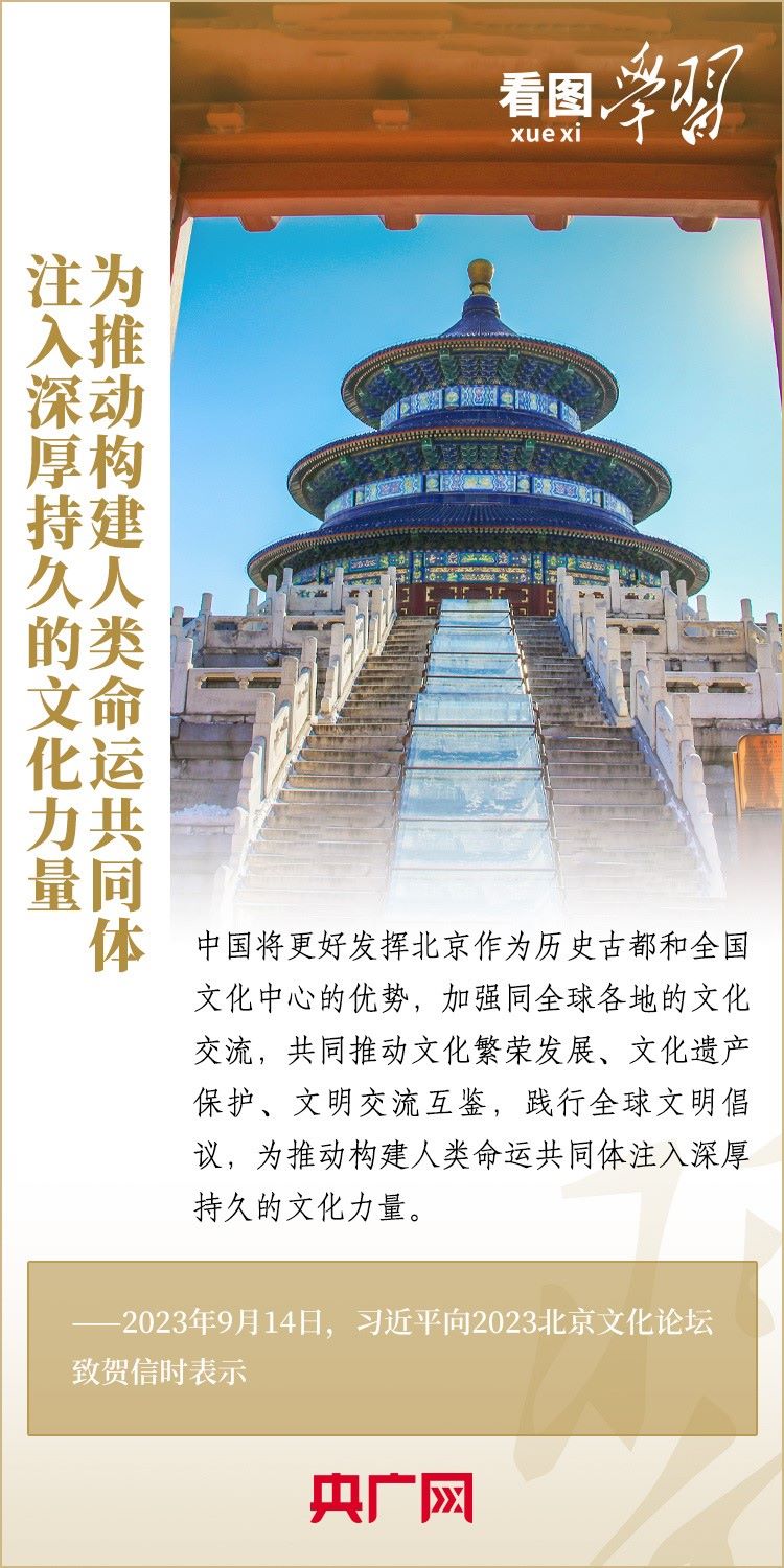 9月14日,以“傳承優(yōu)秀文化 促進(jìn)交流合作”為年度主題的2023北京文化論壇在北京開幕。習(xí)近平主席向論壇致賀信表示,中國將更好發(fā)揮北京作為歷史古都和全國文化中心的優(yōu)勢,加強(qiáng)同全球各地的文化交流,共同推動文化繁榮發(fā)展、文化遺產(chǎn)保護(hù)、文明交流互鑒,踐行全球文明倡議,為推動構(gòu)建人類命運(yùn)共同體注入深厚持久的文化力量。