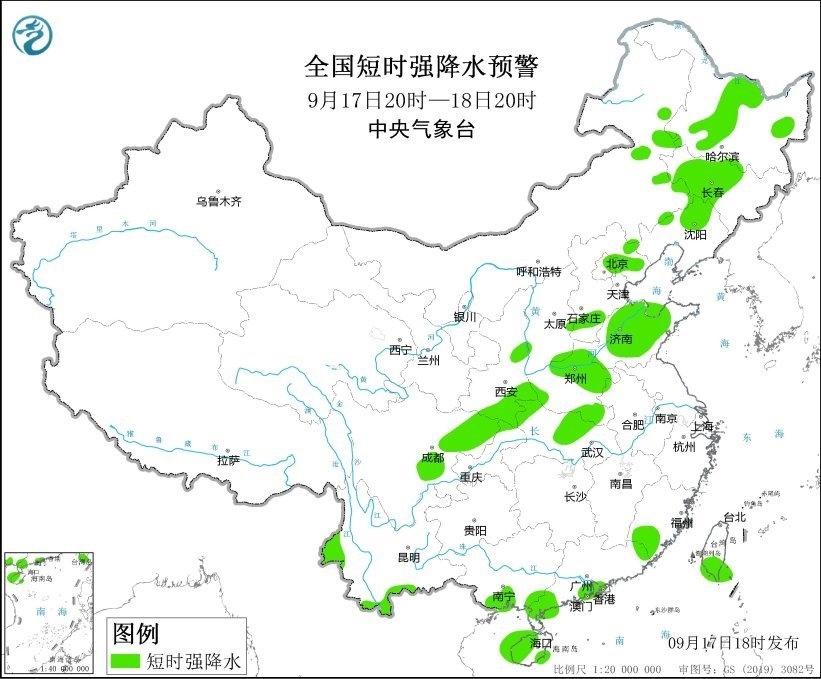 央視網消息:據中央氣象臺網站消息,中央氣象臺9月17日18時繼續(xù)發(fā)布強對流天氣藍色預警。預計9月17日20時至18日20時,內蒙古東部、黑龍江南部和東北部、吉林中西部、遼寧中西部、陜西北部和中部、山西北部和東南部、河北東北部和南部、北京東北部、天津北部、山東西北部、河南中北部和東部、湖北北部等地的部分地區(qū)將有8-10級雷暴大風或冰雹天氣,局地風力可達11級以上;內蒙古東部、黑龍江中西部、吉林中西部、遼寧西部和北部、陜西南部、河北東北部和南部、北京東北部、天津北部、山東中西部、河南北部和東部、湖北中部和西部、福建南部、四川盆地中東部、云南西部和南部、廣西南部、廣東西南部、海南島、臺灣島南部等地的部分地區(qū)將有短時強降水天氣,最大小時雨量20-50毫米,局地可達60毫米以上。