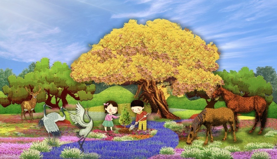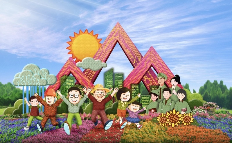 4,東單西北角的“和諧共生”花壇頂高8.5米,“三北工程”綠色長城為主景,配以野馬(西北)、麋鹿(華北)、白鶴(東北)、胡楊等典型物種,體現(xiàn)了生態(tài)治理的典范,寓意堅(jiān)定不移走好人與自然和諧共生的中國式現(xiàn)代化之路。