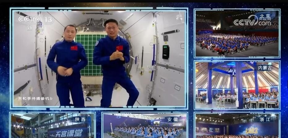 在約48分鐘的授課中,神舟十六號(hào)航天員景海鵬、朱楊柱、桂海潮生動(dòng)展示介紹了空間站夢(mèng)天實(shí)驗(yàn)艙工作生活場(chǎng)景,演示了球形火焰實(shí)驗(yàn)、奇妙“乒乓球”實(shí)驗(yàn)、動(dòng)量守恒實(shí)驗(yàn)以及又見(jiàn)陀螺實(shí)驗(yàn),并生動(dòng)講解了實(shí)驗(yàn)背后的科學(xué)原理。授課期間,航天員通過(guò)視頻通話(huà)形式與地面課堂師生進(jìn)行了實(shí)時(shí)互動(dòng)交流。