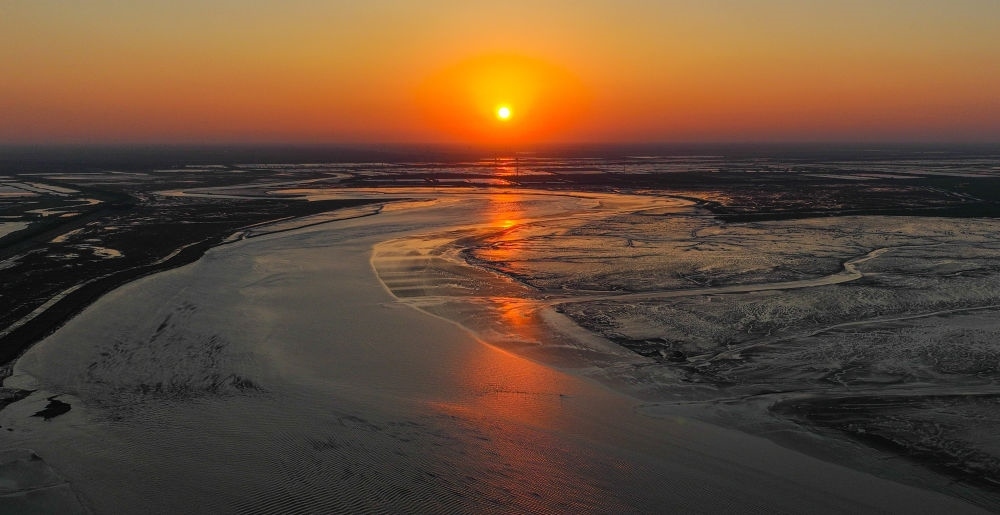 這是鹽城東臺(tái)條子泥濕地日出景色(9月1日攝,無人機(jī)照片)。